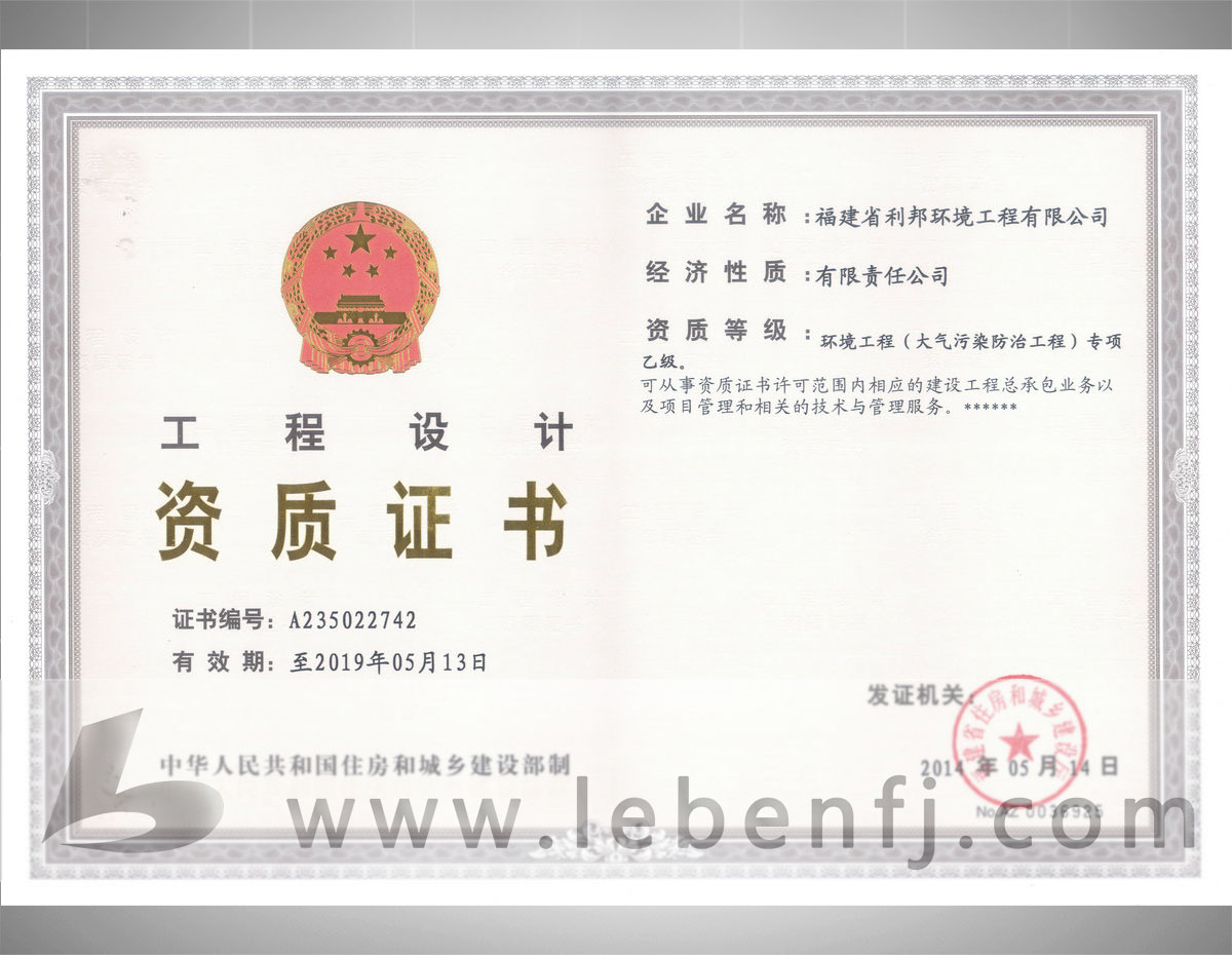 • 環(huán)境工程設(shè)計(jì)專項(xiàng)資質(zhì)(乙級)